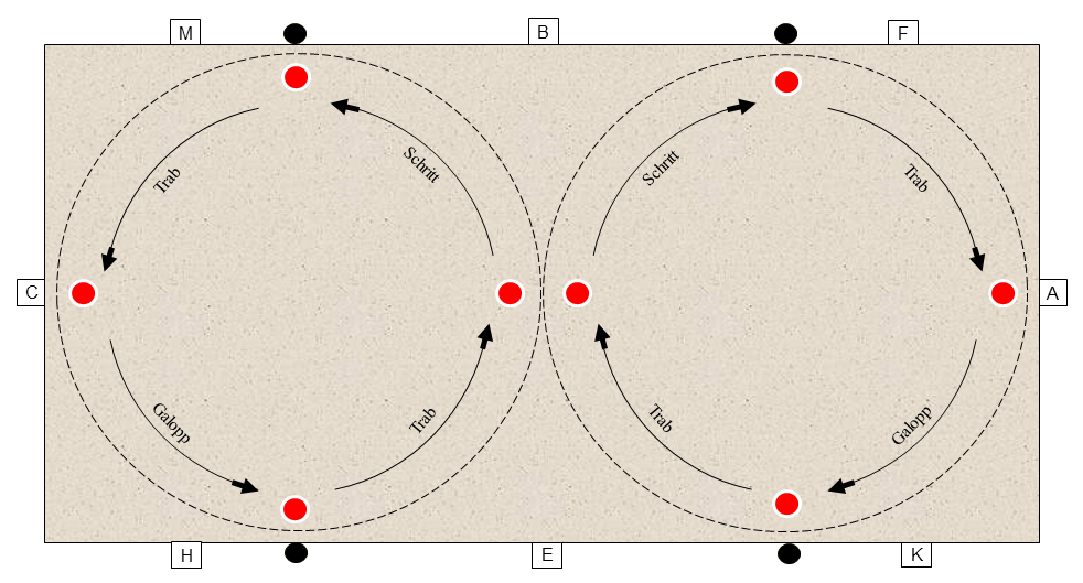 Auf dem Zirkel geritten im Schritt, Trab und Galopp, jeweils nur einen halben oder viertel Kreis.
