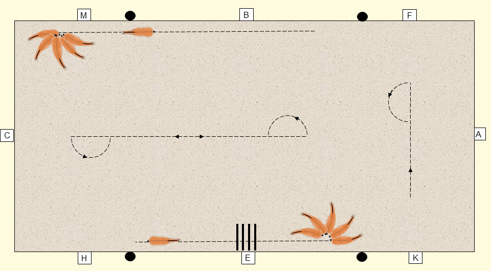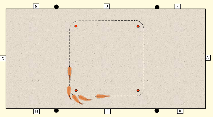 Hinterhandwendung (90°) Bevor mit einer Hinterhandwendung begonnen wird, sollte das Pferd eine Kurzkehrt-Wendung sicher beherrschen. Auch bei der Hinterhandwendung ist es sinnvoll, zunächst mit einer 90°-Wendung zu beginnen und die nach vorn begrenzende Wirkung der Bande zur Unterstützung auszunutzen. Der Einsatz von Pylonen bietet dabei sowohl für das Pferd als auch für den Reiter eine zusätzliche Hilfe.