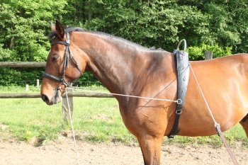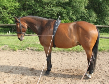 Hinweis: Bei sehr sensiblen Pferden ist es ratsam, sie schon beim einfachen Longieren an die äußere Longe zu gewöhnen, indem man am Longiergurt eine Bandage befestigt, die um die Hinterhand gelegt wird.