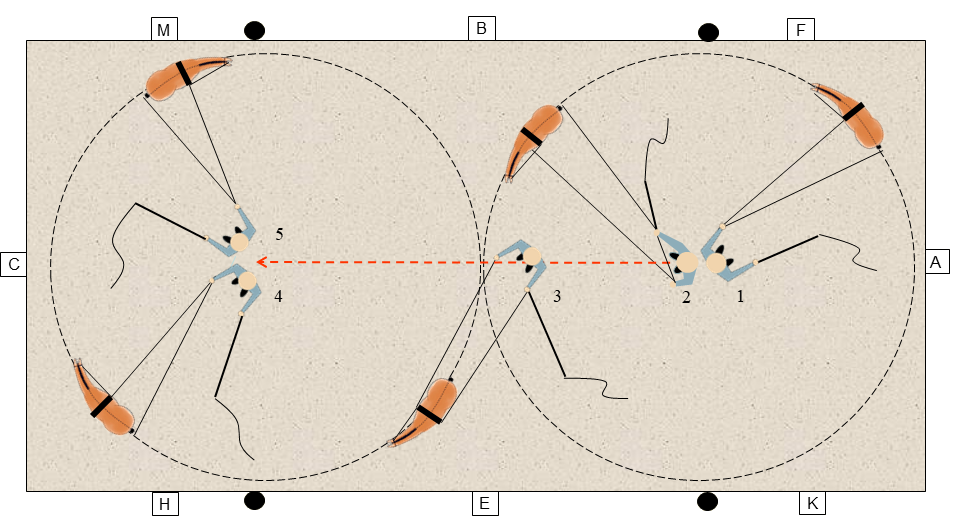 Die Hilfengebung auf den Halbbogen ist genauso, wie beim "Aus dem Zirkel wechseln" (siehe: Handwechsel). Dazwischen wird das Pferd einige Schritte geradeaus begleitet.