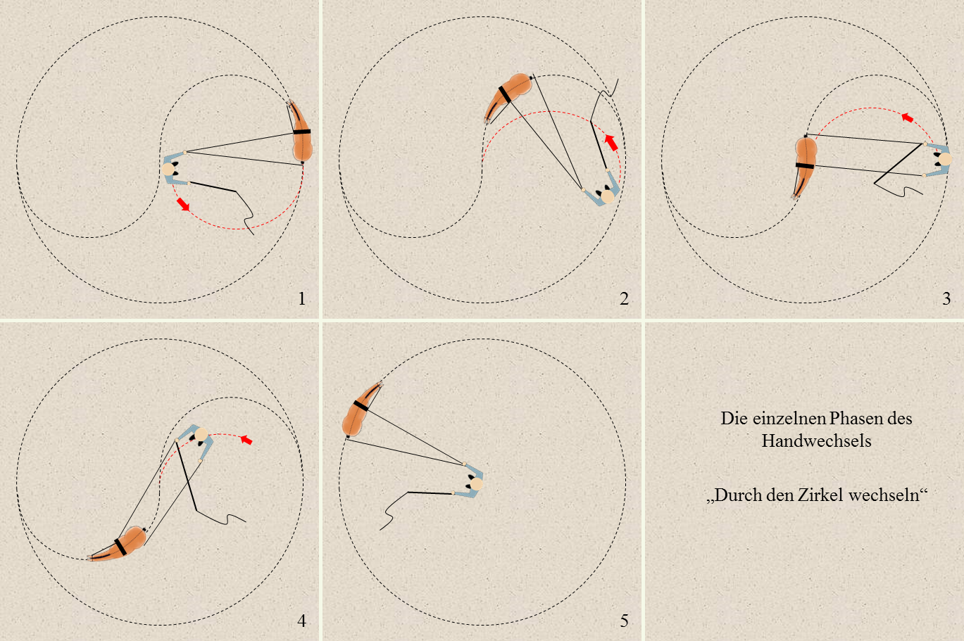 Zum Beginn des Handwechsels nimmt der Longenführer die innere Longe etwas an und begibt sich auf einem Kreisbogen nach außen zur Zirkellinie. Seine Positionsänderung veranlasst das Pferd, in die Zirkelmitte zu kommen. Dabei sollte er immer versuchen, im rechten Winkel zum Pferd zu bleiben. In der Zirkelmitte wird das Pferd umgestellt und der Peitschenwechsel vorgenommen. Danach kehrt der Longenführer wieder in einem flachen Halbbogen zu seiner Ausgangsposition zurück und treibt das Pferd unter Anlehnung auf den Hufschlag hinaus. Gleichzeitig muss er den Längenausgleich der Longen vornehmen. Ist das Pferd auf dem Hufschlag angekommen, kann er in Ruhe die Leinen ordnen und es wieder korrekt einstellen.