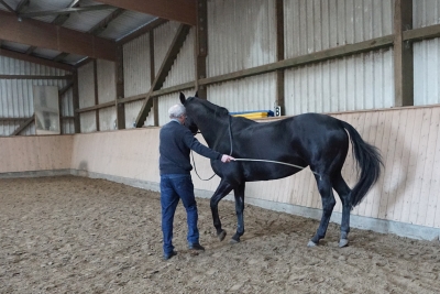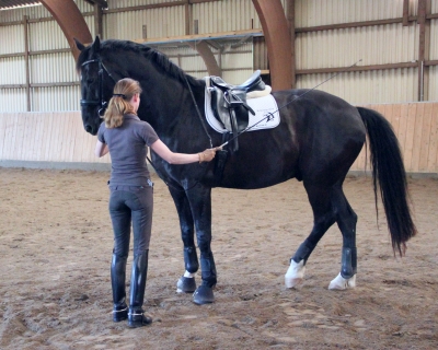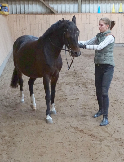 Der Ausbilder steht auch bei dieser Übung an der Schulter des Pferdes. Im Gegensatz zur üblichen Vorhandwendung jedoch an der äußeren Seite. Er fasst mit einer Hand in den äußeren Trensenring und übernimmt mit der anderen Hand den über den Widerrist geführten inneren Zügel. Die Gerte wird wieder auf Kniehöhe mit genügend Abstand parallel zum Pferd gehalten. Da das Pferd grundsätzlich gelernt hat, auf Berührungen der Gertenspitze mit der Hinterhand seitlich auszuweichen, kann der Ausbilder sich auf die korrekte Stellung und Biegung konzentrieren.
