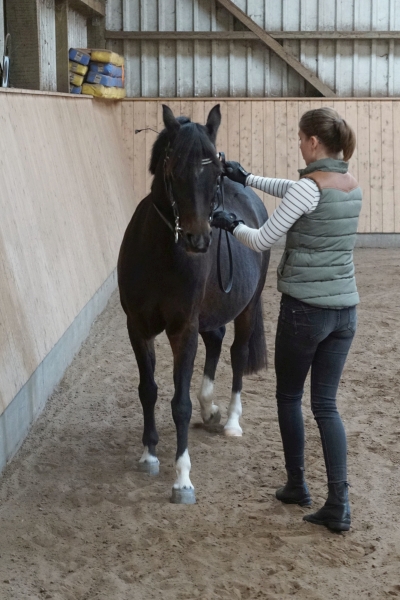 Abkau- und Biegeübungen an der Hand ersetzen nicht die bewegungsorientierte Lösungsphase, aber sie können Verspannungen im Maul, im Genick und im Halsbereich des Pferdes lösen. Ein Pferd, das zufrieden kaut, ist immer ein entspanntes Pferd. Ziel der Übung ist es, das Pferd auch beim Reiten auf dieses Verhalten zu konditionieren.