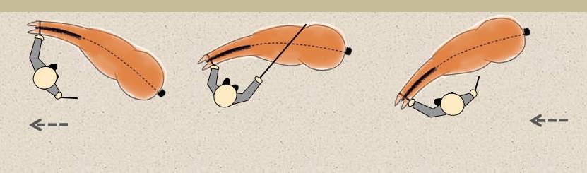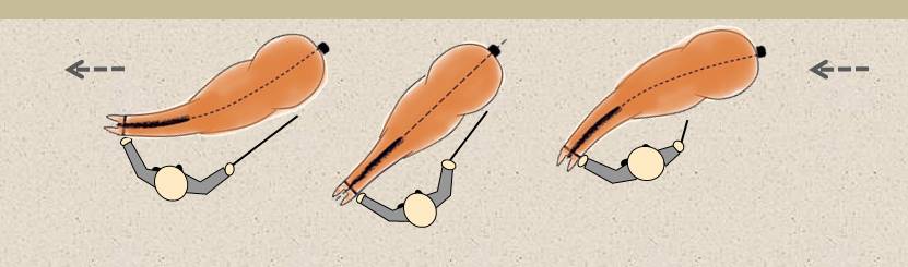 Das Pferd soll nicht mit der Hinterhand herumschleudern, sondern die Wendung Schritt für Schritt ausführen. Die Gerte darf also auf keinen Fall ununterbrochen eingesetzt werden. Sie muss sofort entfernt werden, wenn das Pferd auch nur den Ansatz zu einer Seitwärtsbewegung macht. Anstelle der Gerte muss dann ein sofortiges Lob erfolgen, und erst nach einer kleinen Pause wird es zum nächsten Schritt aufgefordert. (Siehe auch: Dressur: Stellung/Biegung und Vorhandwendung)
