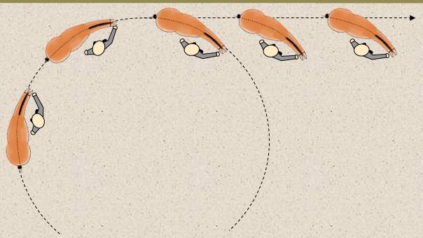 Für diese Übung geht der Ausbilder wieder an der Schulter des Pferdes. Zunächst auf dem Zirkel bzw. auf der Volte mit Blickrichtung nach vorn. Bei Erreichen des ersten Hufschlags geht er noch einen Schritt auf dem Kreisbogen weiter, so, als wollte er einen neuen Kreis beginnen. In dem Augenblick, wo sich die Schulter des Pferdes vom Hufschlag löst, nimmt er den äußeren Zügel etwas an, dreht sich zum Pferd und veanlasst es durch seine Körpersprache von der Kreislinie auf die Gerade zu wechseln. Ein leichtes Touchieren mit der Gerte hinter der Schulter erinnert das Pferd gegebenfalls an die Rippenbiegung. Nach ein paar Schritten wird die Vorhand wieder auf den Hufschlag geführt und das Pferd angehalten und gelobt.
