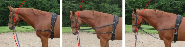 Die Kopflonge ist eine absolut unsinnige Variante. Sie wird vom inneren Gebissring über das Genick zum äußeren Gebissring geführt. Beim Annehmen der Longe wird gleichzeitig Zug auf die Lefzen und Druck auf das Genick ausgeübt. Eine für das Pferd völlig widersprüchliche und irritierende Hilfengebung, weil es nicht zur selben Zeit den Kopf heben und senken kann! Unabhängig davon ist die Longe für Stellung und Richtung des Pferdes verantwortlich und nicht für das Heben oder Senken des Kopfes.