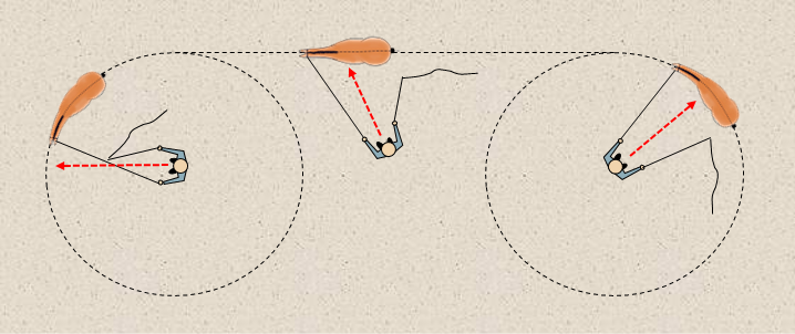 Der Laufferzügel wirkt prinzipiell genauso wie der Ausbinder. Aufgrund der Zweipunktaufhängung am Longiergurt entsteht keine kreisförmige sondern eine elliptische (rot eingezeichnete) Korrekturkurve. Dadurch wird der Bereich der optimalen Anlehnung vergrößert und etwas mehr Abwärtsdehnung zugelassen. Außerdem wird die seitliche Führung geringfügig verbessert. Beides ist in den meisten Fällen von Vorteil.