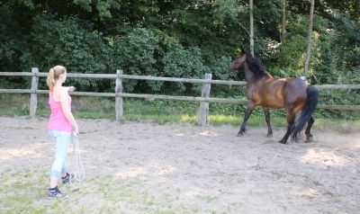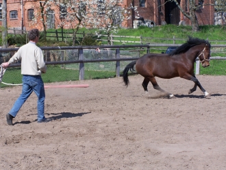 Die letzte Forderung ist sicherlich am schwierigsten umzusetzen, weil man leicht zu einem übertriebenen Aktionismus neigt. Die hektischen Bewegungen verunsichern jedoch nur das Pferd. Genauso verkehrt ist es, dem Pferd hinterherzulaufen, um es anzutreiben. Das Rangordnungsprinzip wird dadurch ins Gegenteil gekehrt. Es stellt sich die Frage: Wer bewegt eigentlich wen?