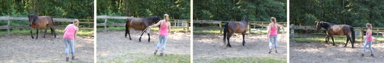 - Auf die andere Seite vom Pferd wechseln, Seil in den Händen tauschen und abweisende Haltung in Zone 1 zeigen (Raum nehmen).