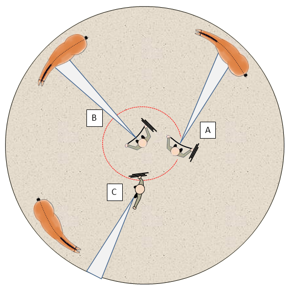 Steht kein Round-Pen zur Verfügung, kann man auch eine Hälfte der Reithalle gut sichtbar absperren. Die daraus entstehende quadratische Grundfläche von 20 * 20 m ist zwar etwas groß und hat den Nachteil, dass die Pferde versuchen, sich in den Ecken der Hilfengebung zu entziehen. Es macht die Aufgabe dadurch aber auch interessanter. Außerdem ergibt sich daraus der Vorteil, dass das Pferd nicht auschließlich auf einer gebogenen Linie läuft, sondern gezwungen ist, ständig zwischen Geraderichtung und Biegung zu wechseln.