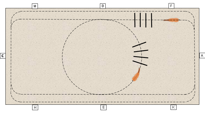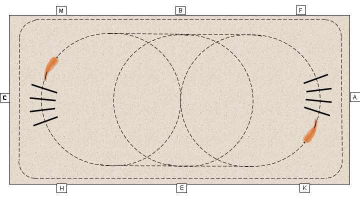 Das Pferd soll auf gerader Linie über die Cavaletti traben, eine Dreiviertelvolte mit entsprechender Längsbiegung ausführen und wieder geradegestellt zwischen den mittleren Bodenstangen durchtraben. (Nach vier Durchläufen entsteht aus der Hufschlaglinie die Form eines Kleeblatts.)