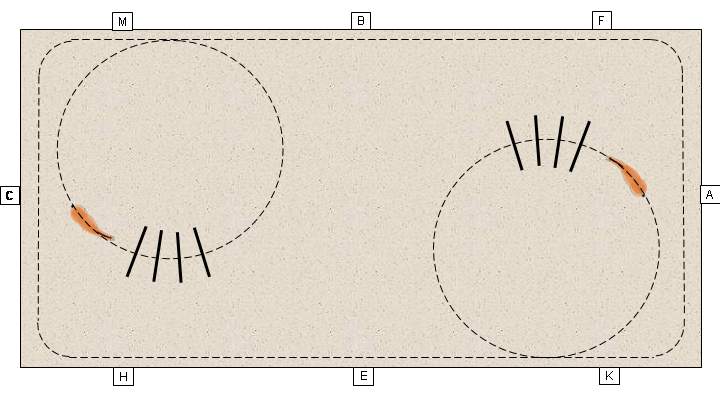 Ein Aufbau neben dem Hufschlag ist für das Pferd bereits etwas schwieriger, hat aber den Vorzug, dass er vielseitiger verwendbar ist, weil der erste Hufschlag (auch für andere Reiter) frei bleibt und man nicht bei jeder Runde über die Cavaletti reiten muss.