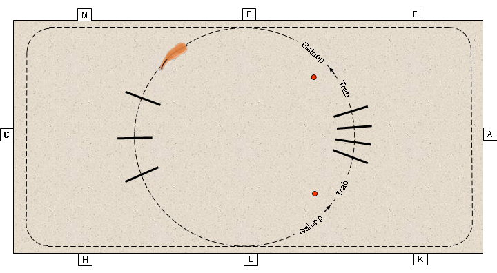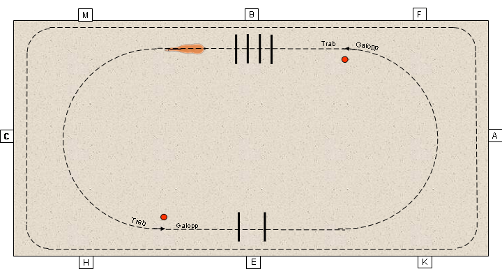 Am Anfang sollte ein einfacher Cavalettiaufbau an der langen Seite - unmittelbar an der Bande mit zusätzlichen Fängen - gewählt werden. (Vorteil: Das Pferd bleibt auf dem gewohnten Hufschlag und wird durch die Fänge zum geraden Anreiten veranlasst.)