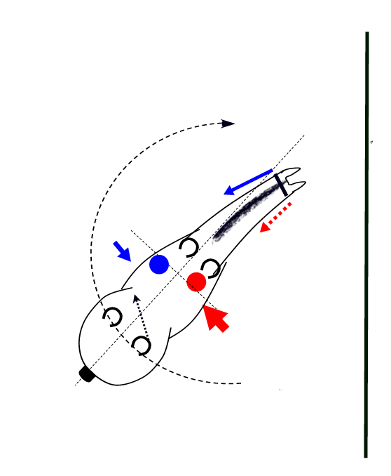 Missverständnisse kann es bei der Richtungsangabe geben. Wenn das Pferd beispielsweise dem rechten Schenkel weichen soll, tritt es mit der Hinterhand nach links (siehe Skizze). Die Hinterhand bewegt sich folglich auf einer Kreislinie im Uhrzeigersinn. Eine Bewegung im Uhrzeigersinn ist jedoch als eine Bewegung nach rechts definiert.