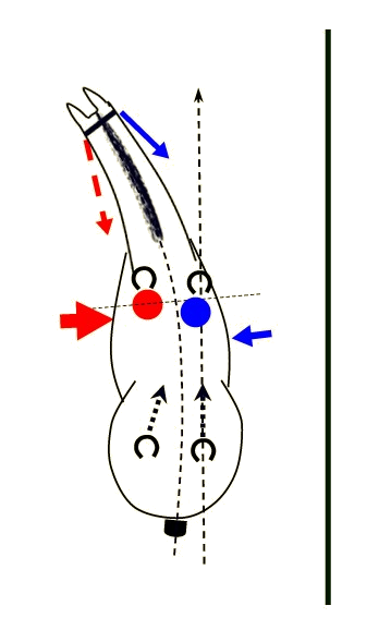 Die Vorstellung des Reiters, auf einen großen Zirkel abwenden zu wollen, dann aber doch unter Beibehaltung der Längsbiegung geradeaus weiter zu reiten, ist oft sehr hilfreich und entspricht im Wesentlichen der Hilfengebung.