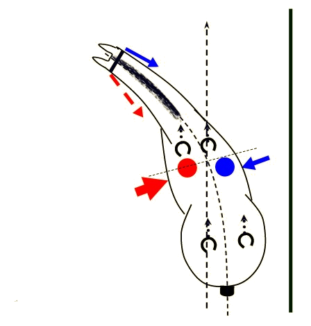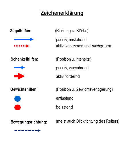 Die Vorstellung des Reiters, eine Volte einzuleiten, dann aber doch unter Beibehaltung der Längsbiegung geradeaus weiter zu reiten, ist oft sehr hilfreich und entspricht im Wesentlichen der Hilfengebung.Zügel: