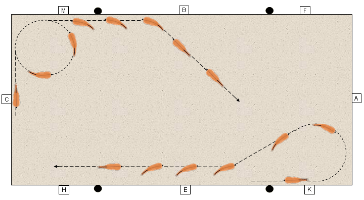 - Nach Beendigung der Lektion muss das Pferd wieder korrekt gerade gestellt werden, indem die Vorhand auf den Hufschlag zurückgeführt wird.