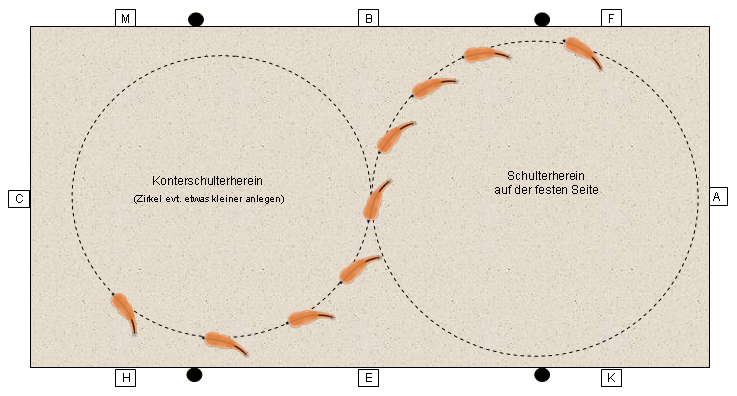 Entwicklung des Schulterhereins aus der Volte unter Mitnahme der Biegung. Anfangs sollte man sich mit wenigen Tritten begnügen, das Pferd überschwänglich loben und es wieder wieder korrekt geradestellen.