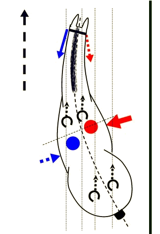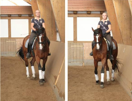 Durch den aus der Hüfte zurückgenommenen äußeren Schenkel wird das Reitergewicht automatisch nach innen verlagert. Der Reiter sitzt also in die Bewegungsrichtung des Pferdes im Einklang mit der Gleichgewichtstheorie. (Das Pferd folgt der Gewichtsverlagerung des Reiters.)