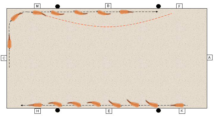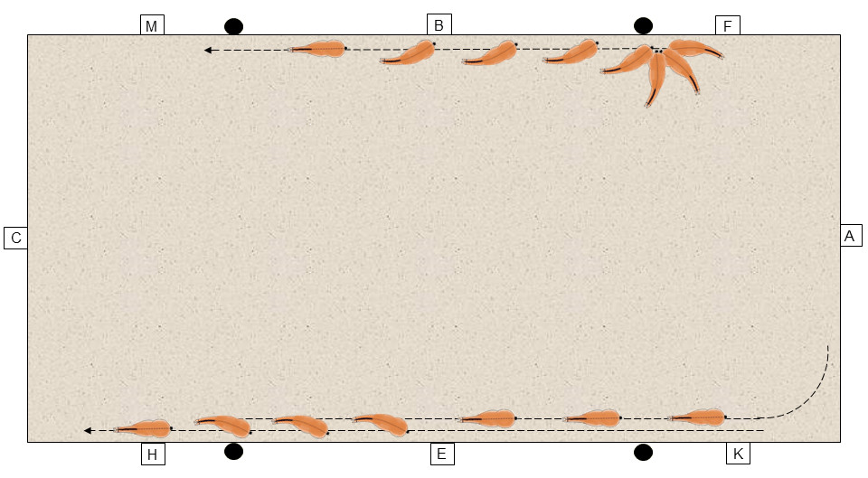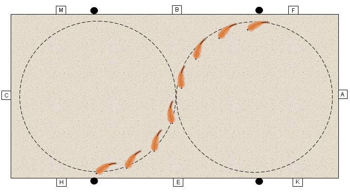 Begründung: In diesem Beispiel muss das Pferd auf beiden Zirkeln mit dem linken Hinterbein unter seinen Schwerpunkt treten. Während des Renvers muss dieses Hinterbein einen größeren Weg beschreiben, als anschließend beim Travers. Das Pferd wird folglich beim Zirkelwechsel die ausgeprägte Bewegung vom Renvers ins Travers übernehmen und gleichzeitig die Entlastung als Belohnung empfinden.